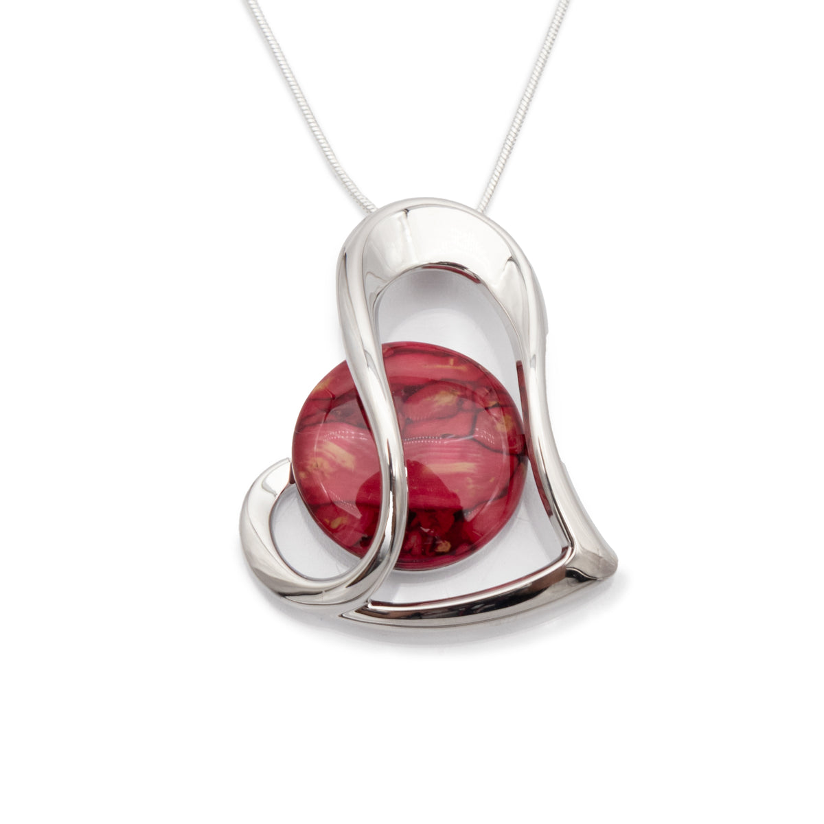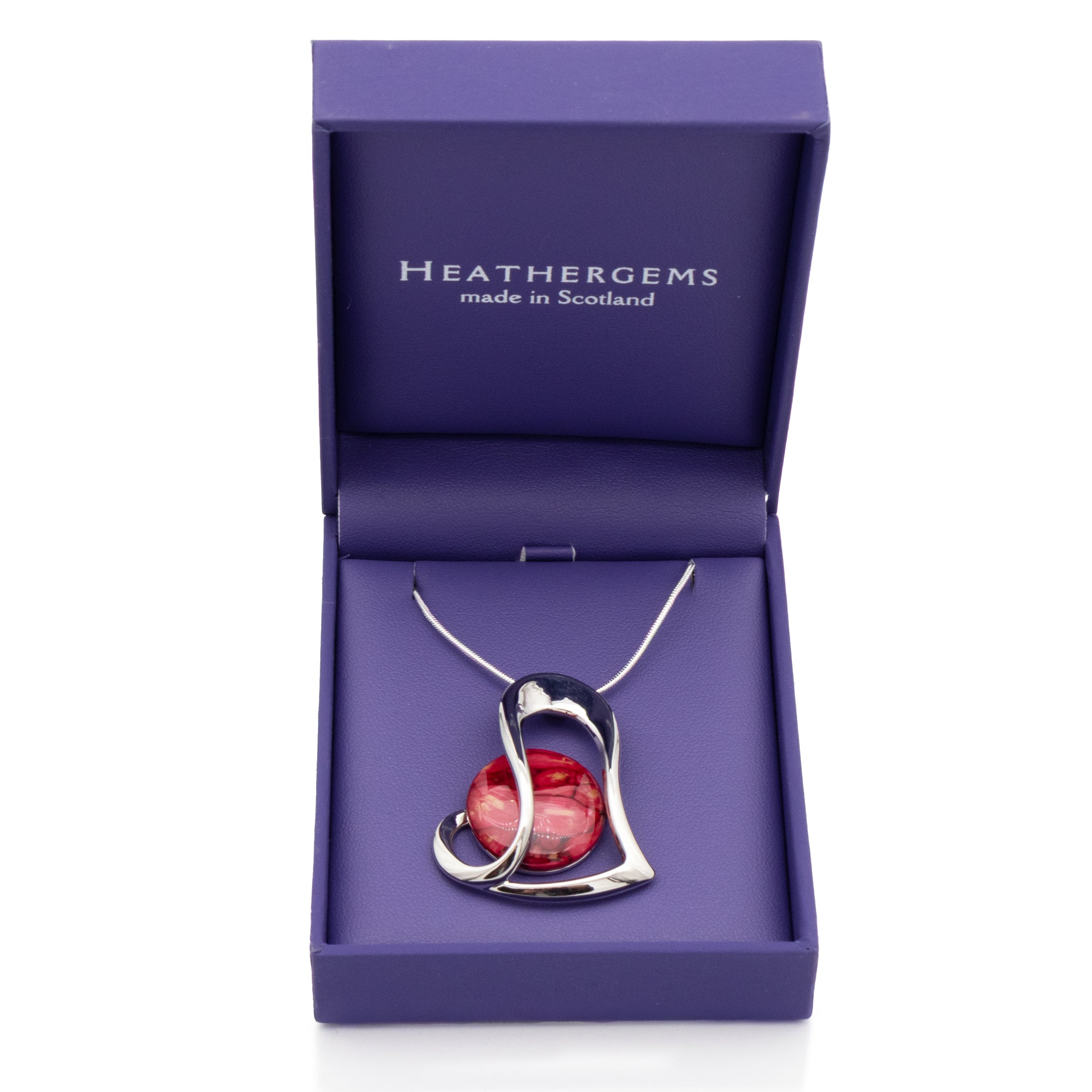 A silver-tone heart pendant inlaid with a unique Heathergem, handmade in Pitlochry, Scotland. Each gem is crafted from compressed natural heather, dyed and shaped to create one-of-a-kind colour variations. A meaningful piece that reflects the beauty of the Scottish landscape and the individuality of its wearer.