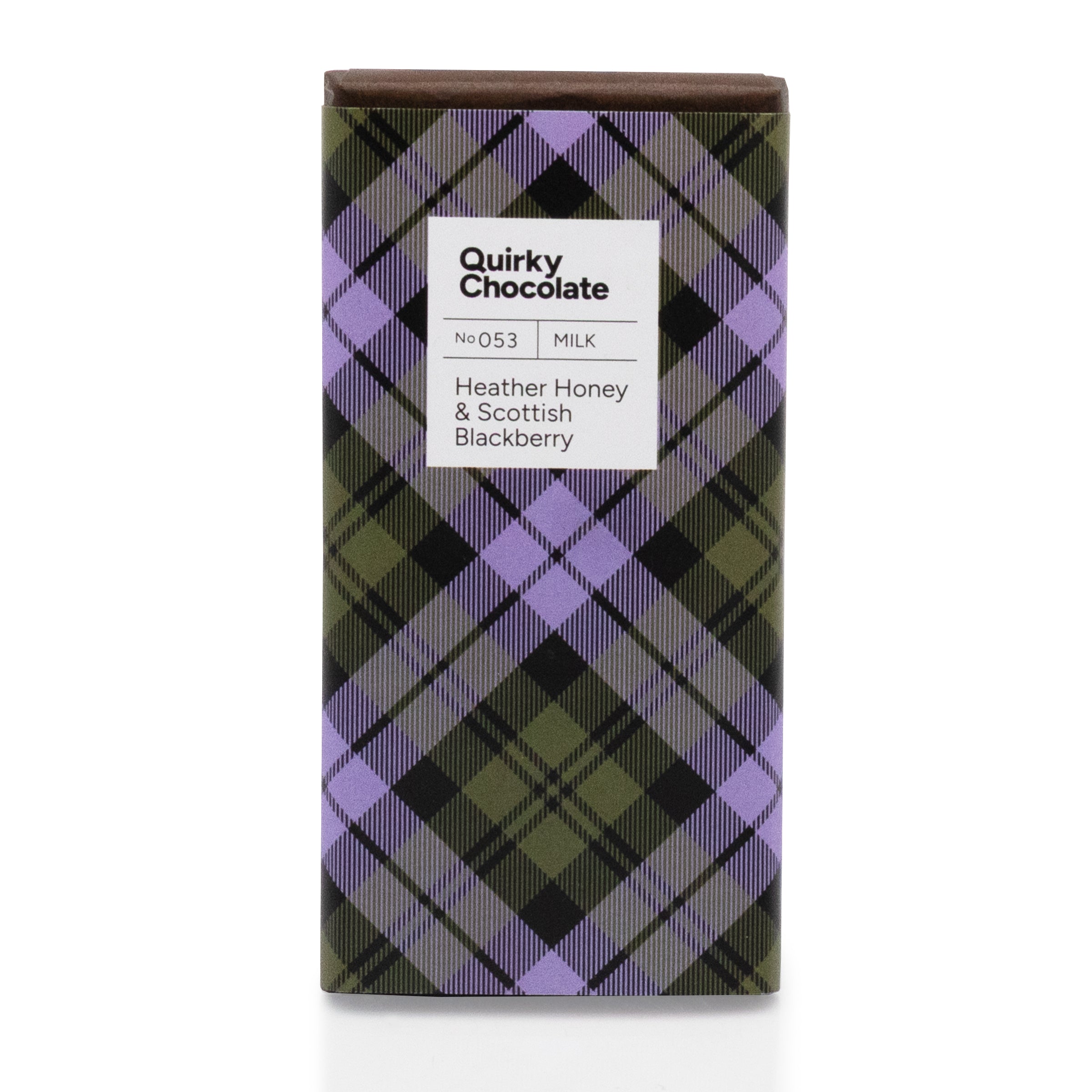 A smooth milk chocolate bar infused with sweet honey and tart blackberry. Handmade in Scotland by Quirky Chocolate.