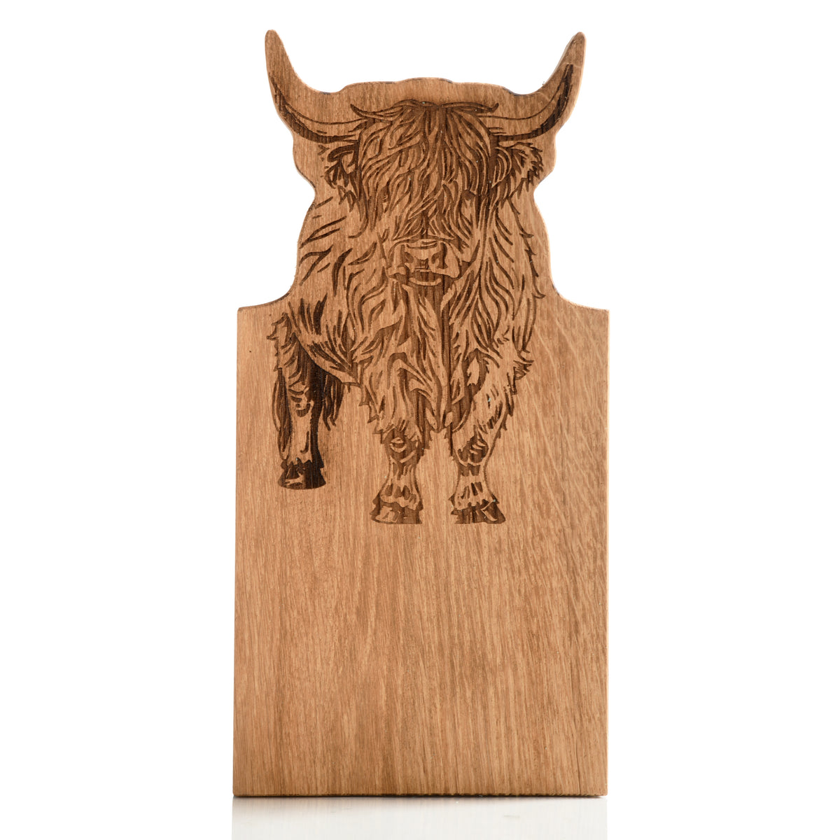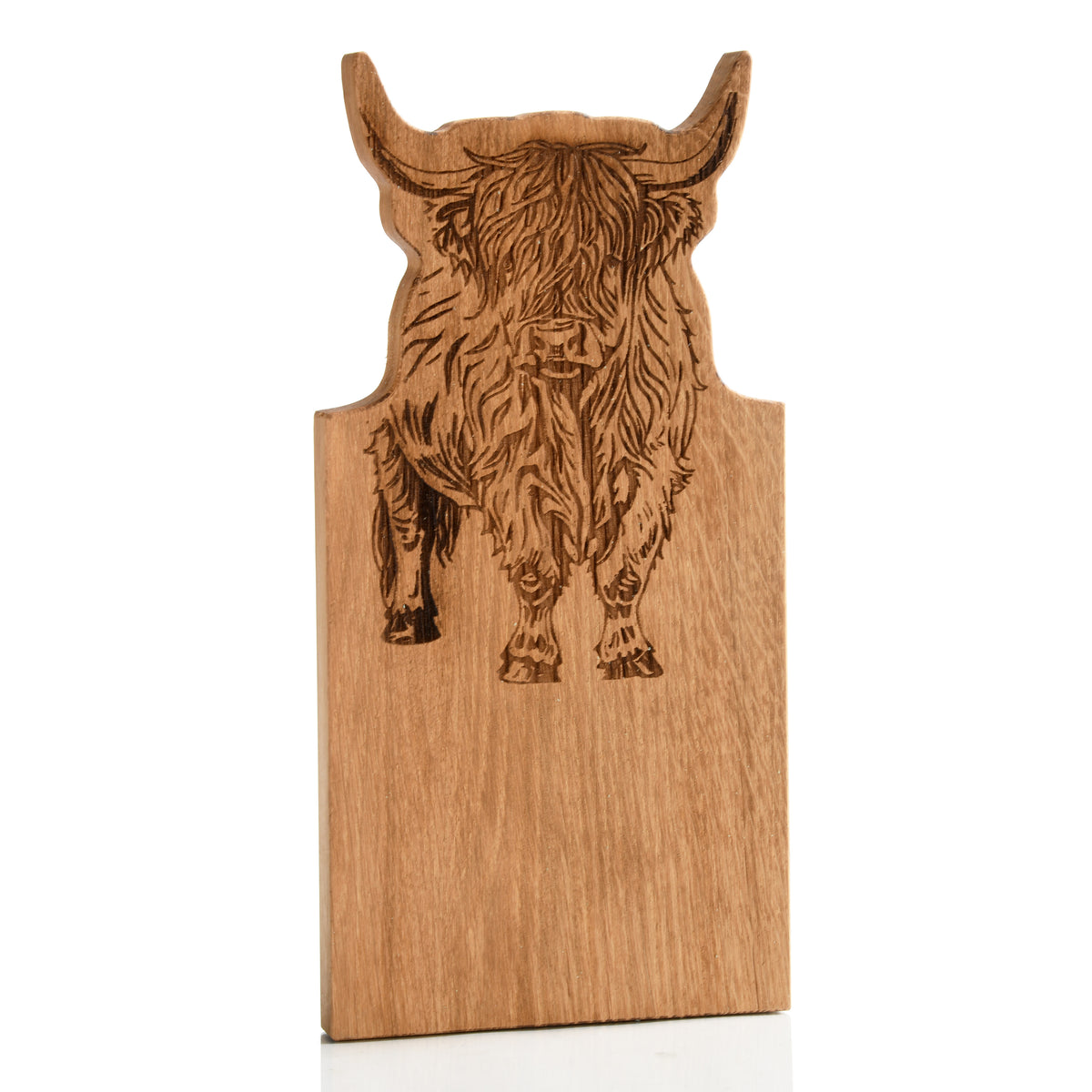 Add an extra dimension to your serving and entertaining experience with this exquisitely crafted serving board. Made in Scotland using sustainable Scottish oak, this board features an engraving of Scotland's favourite animal - the majestic Highland cow.