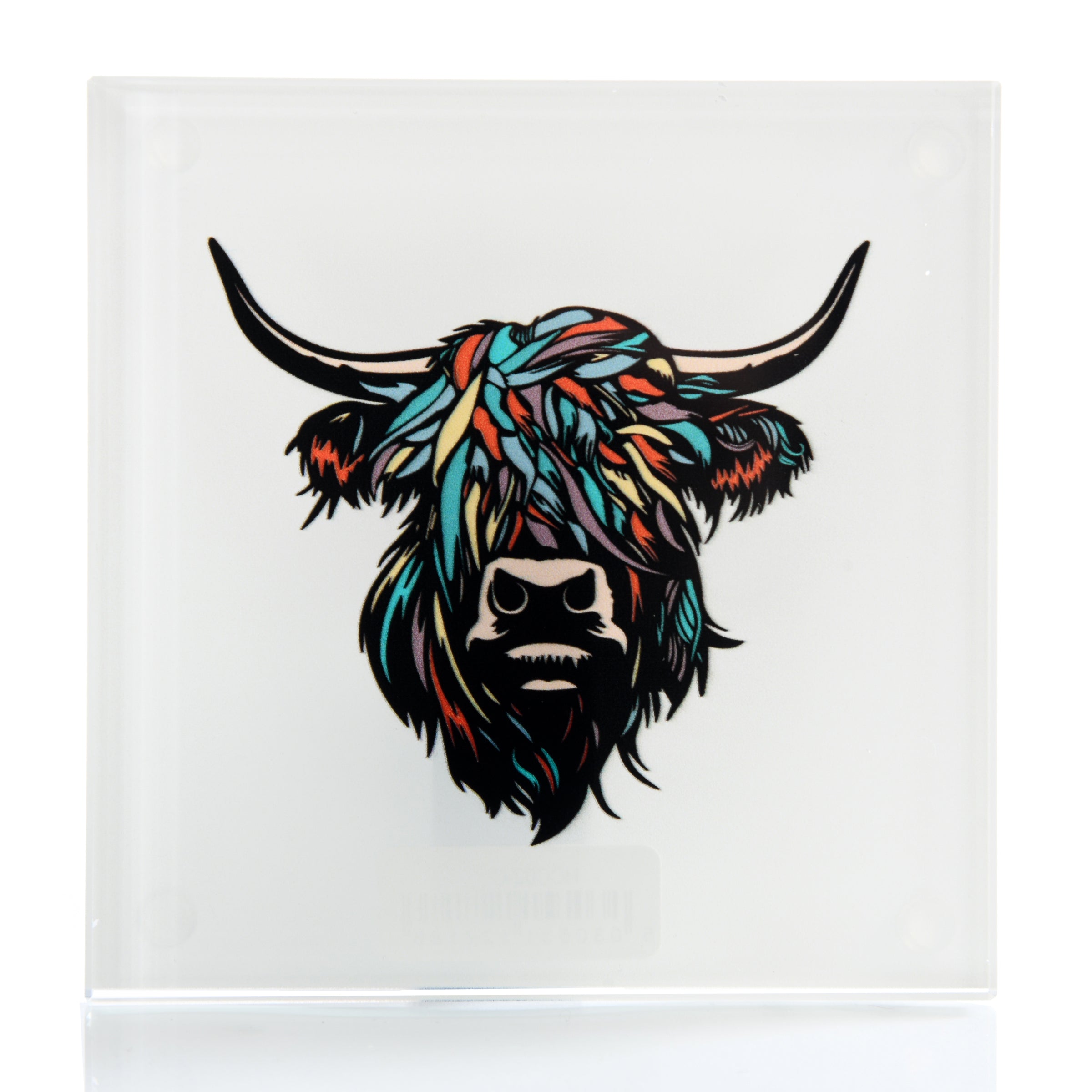 This striking coaster features a sleek cream base, contrasted by a vibrant, multicoloured Highland cow design. The high quality glass construction not only protects your surfaces but also showcases the playful and artistic representation of Scotland's beloved Highland cattle. Perfect for adding a splash of colour and personality to any space, this coaster also makes a unique and charming gift for those who appreciate both style and Scottish heritage.