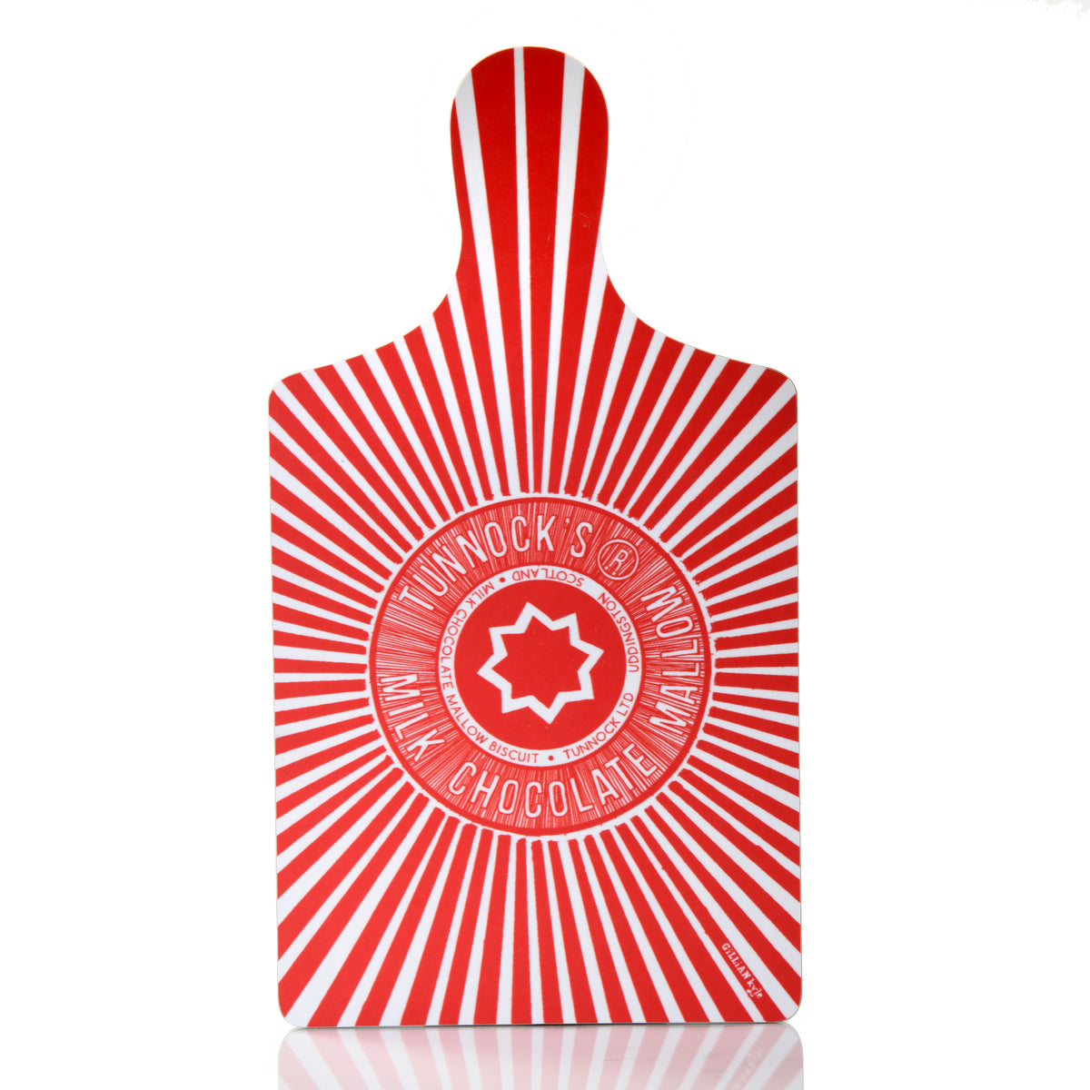 Gillian Kyle's Tunnock’???s Tea Cake Wrapper wood and melamine chopping board makes a really unique and fun Scottish Gift. It's proudly made in Scotland too! This design celebrates the iconic Tunnock’???s Tea Cake and its shiny foil wrapper, made in Uddingston just outside of Glasgow since 1956.